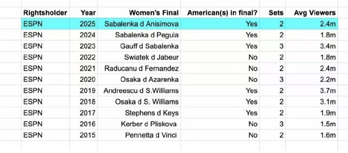 美网11年决赛平均收视女胜男,辛纳和阿卡会师非赞助商心中所愿